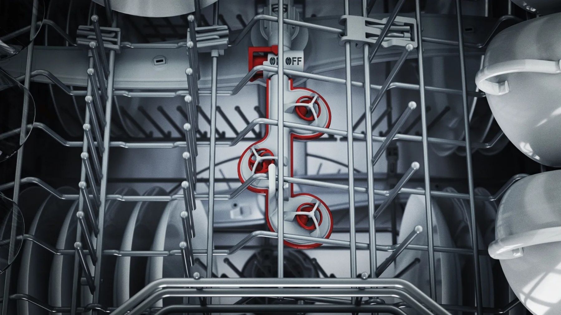 Короби для посуду:Верхній короб з системою 3-рівневого регулювання по висоті Rackmatic, Третій короб VarioDrawer, 2 складані решітки для тарілок у верхньому коробі, 6 складаних решіток для тарілок у нижньому коробі