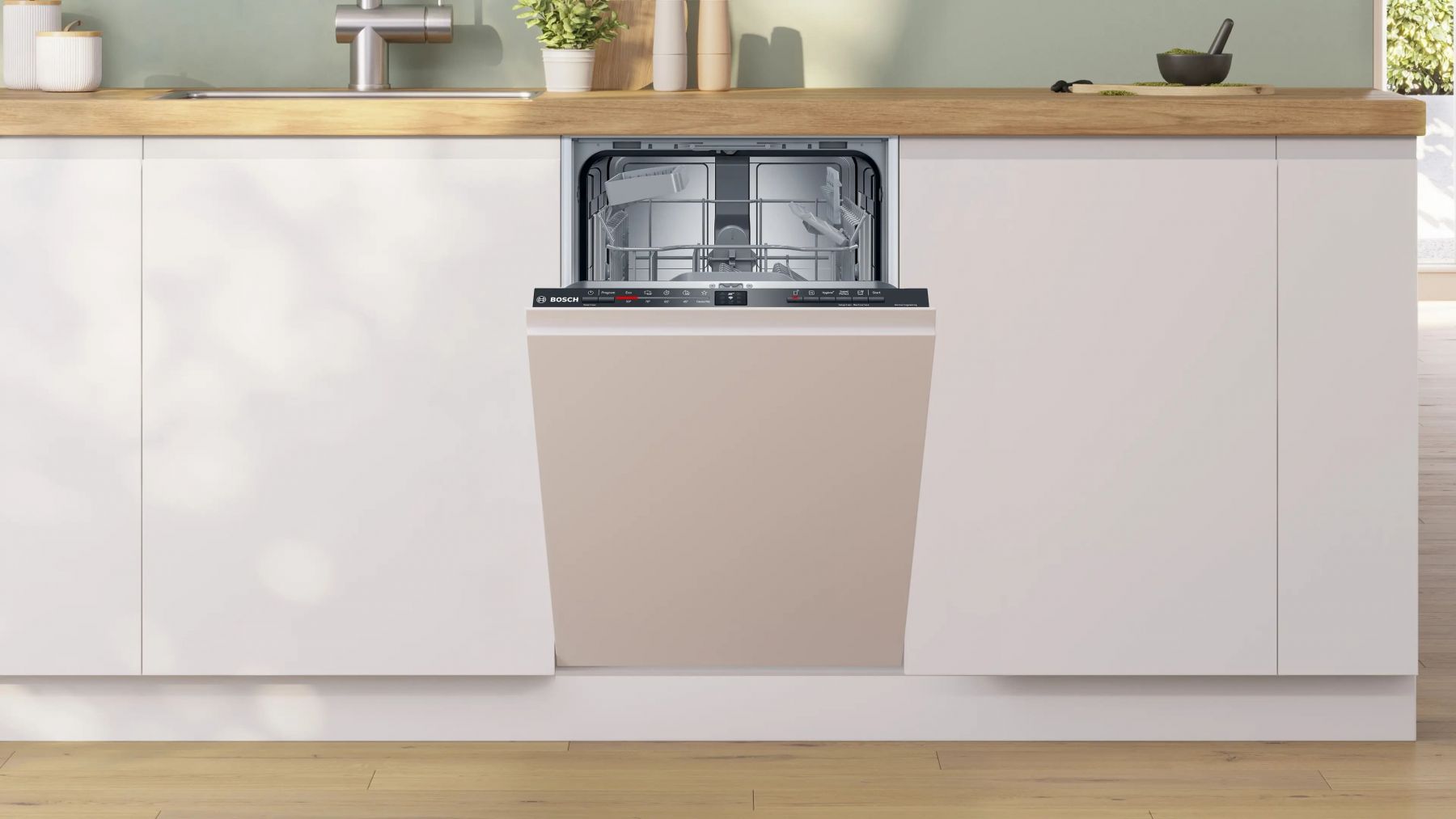 Вбудована посудомийна машина Bosch Serie 2 SPV2IKX01K, шириною 45 см, на 9 комплектів, енергоефективність класу F, низький рівень шуму — 48 дБ(A), із захистом AquaStop, 5 програмами мийки та технологіями SpeedPerfect і HygienePlus.