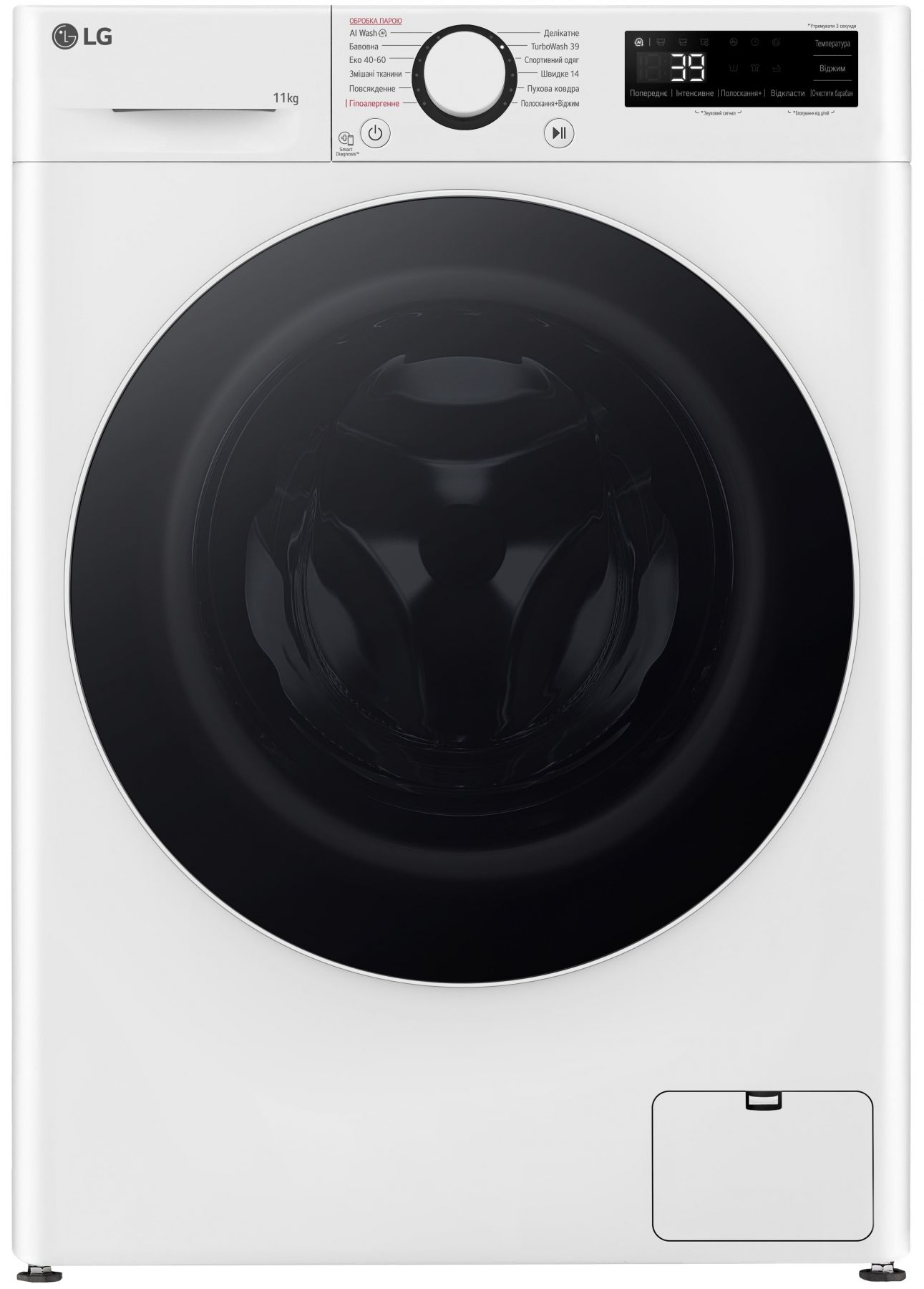 Програми:спортивний одяг, Еко 40-60, Змішані тканини, Повсякденне прання, Полоскання + Віджим, Гіпоалергенне прання, TurboWash 39, Прання з ШІ (AI Wash), Швидке 14, Делікатне прання, Пухові ковдри, Попереднє прання