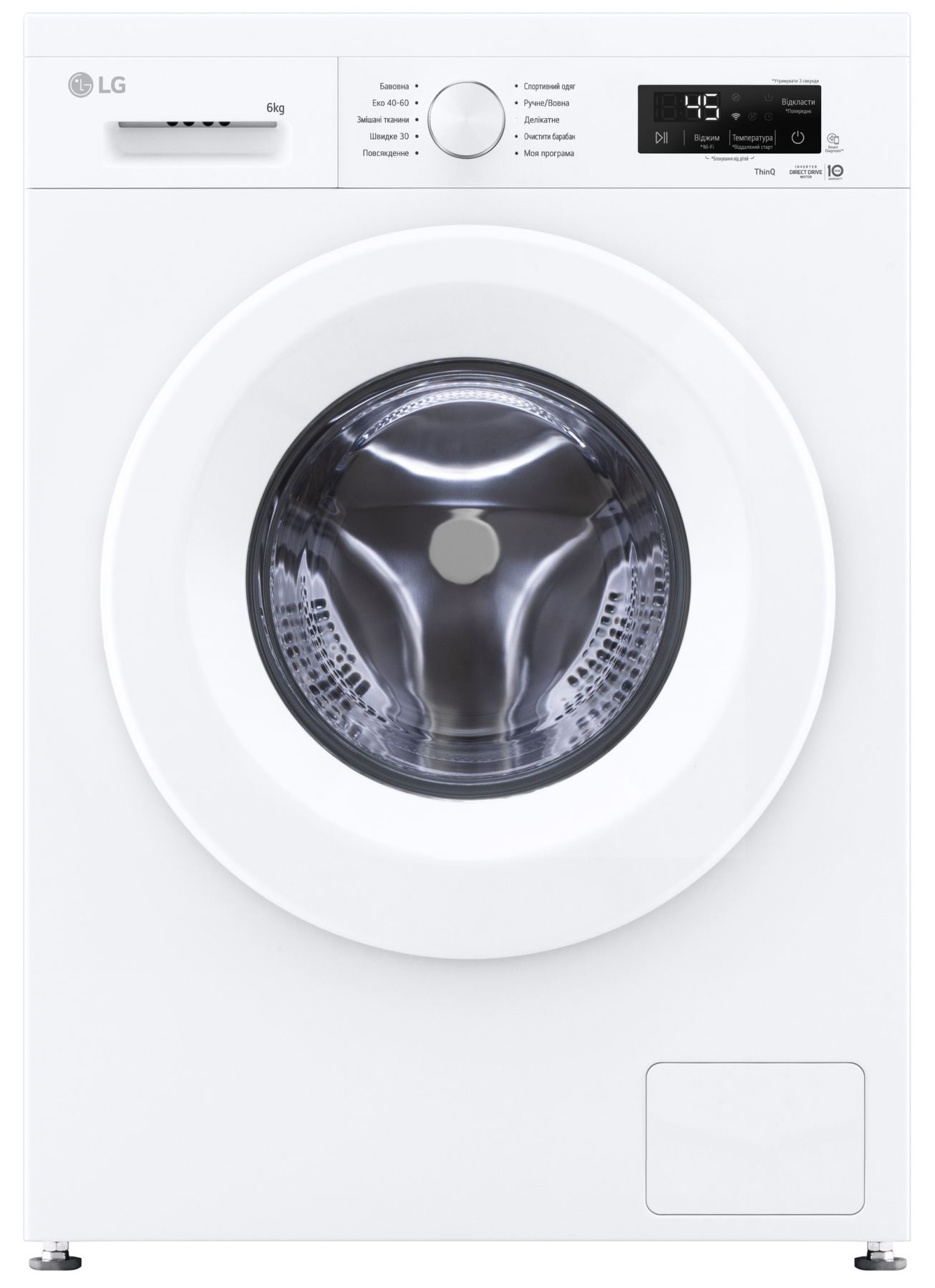 Програми:Бавовна, Делікатна, спортивний одяг, Моя програма, Еко 40-60, Додаткові програми прання, що завантажуються через додаток LG ThinQ, Вовна / Ручне прання, Змішані тканини, Повсякденне прання, Швидке прання 30'