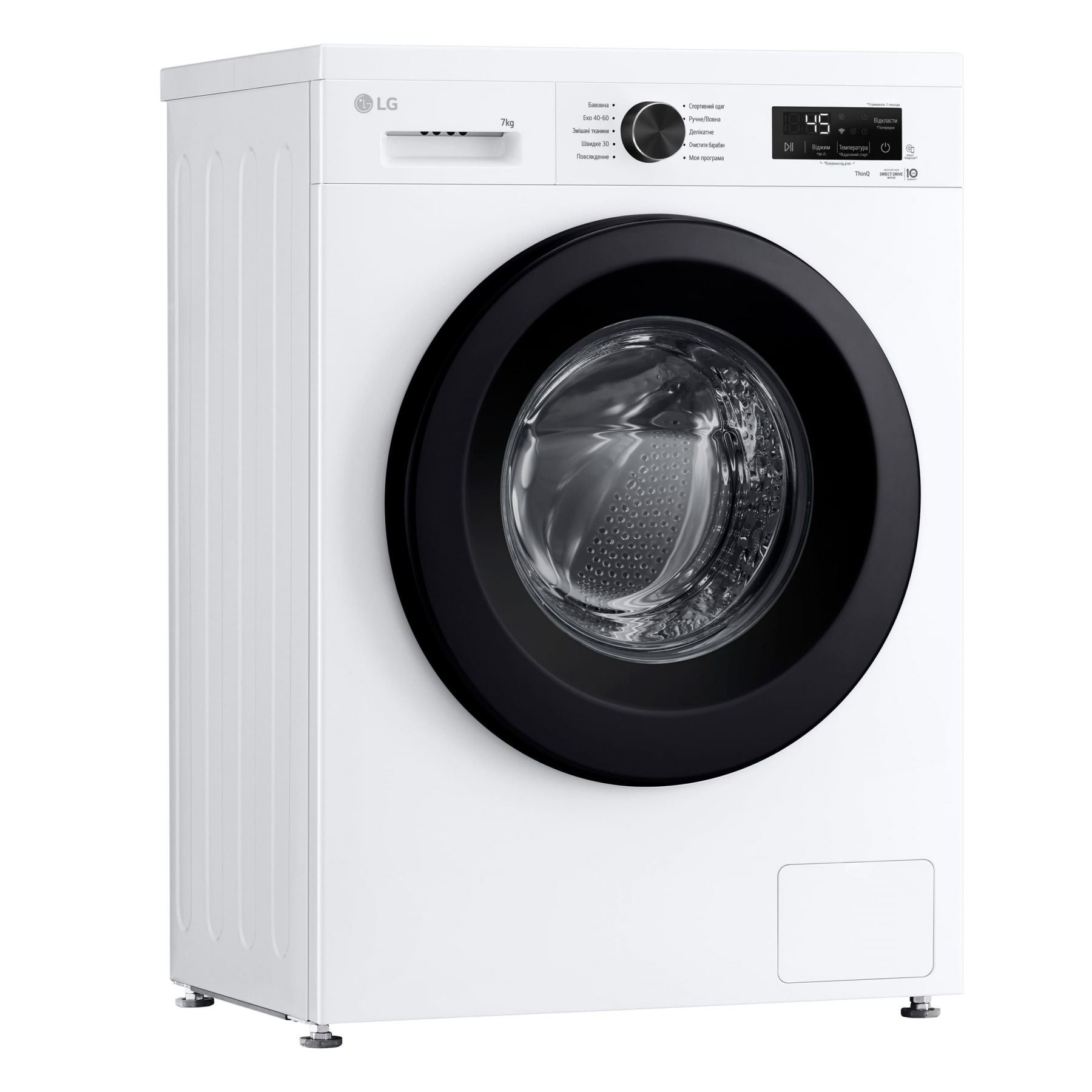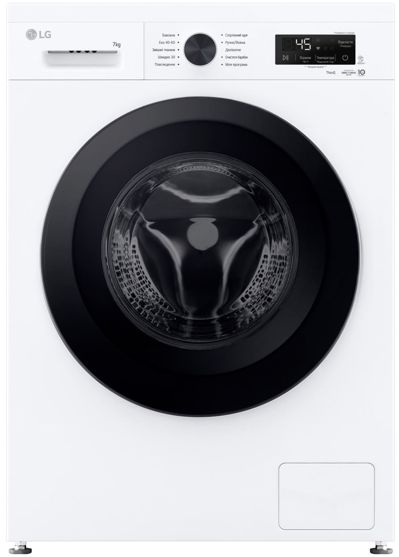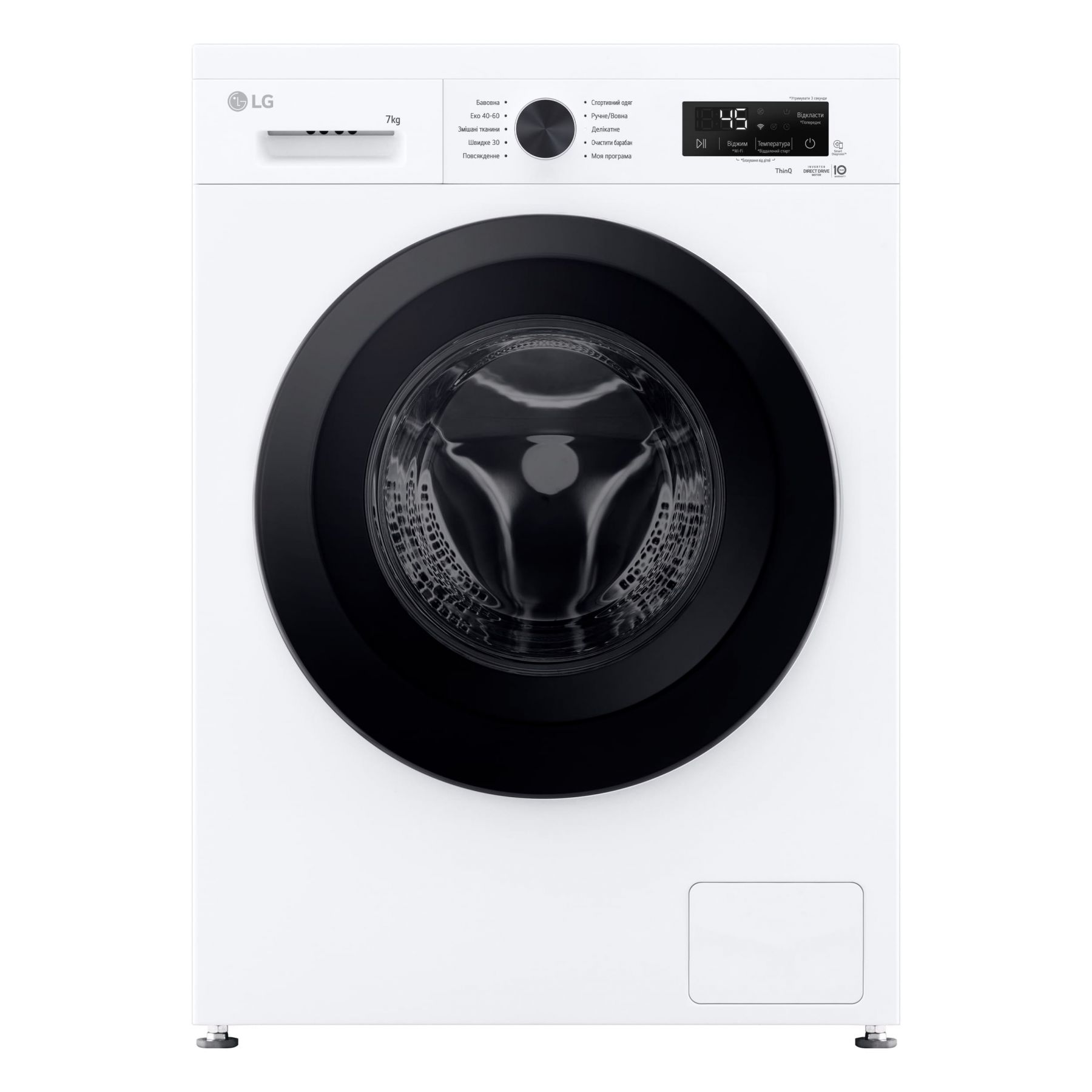 Програми:Бавовна, Делікатна, спортивний одяг, Швидке прання, Моя програма, Еко 40-60, Додаткові програми прання, що завантажуються через додаток LG ThinQ, Вовна / Ручне прання, Змішані тканини, Повсякденне прання, Очищення барабана, Звичайне полоскання, Пришвидшення прання