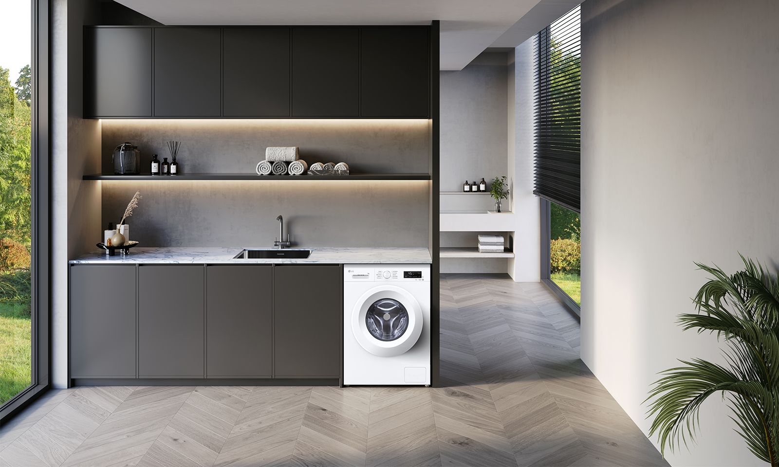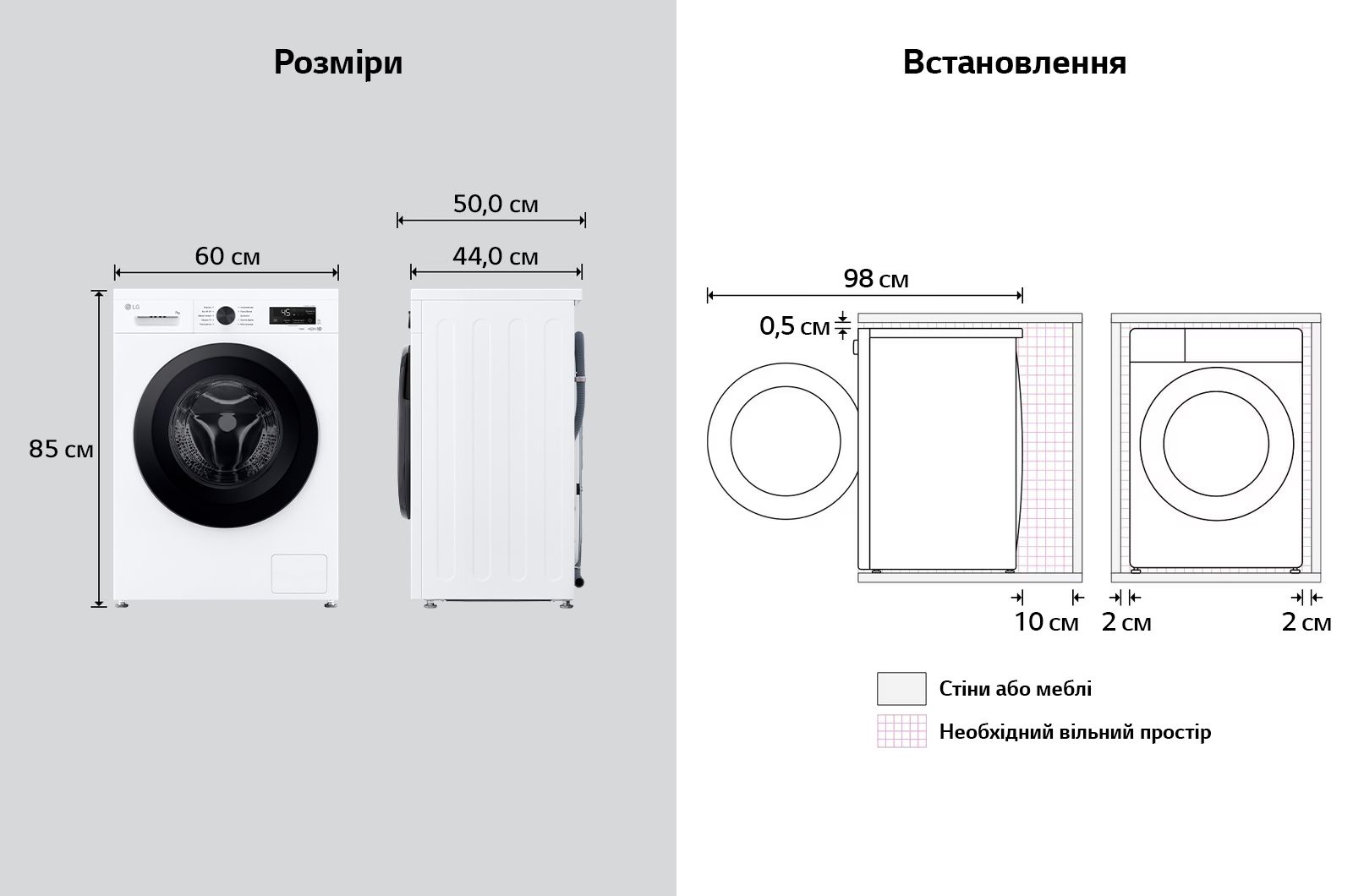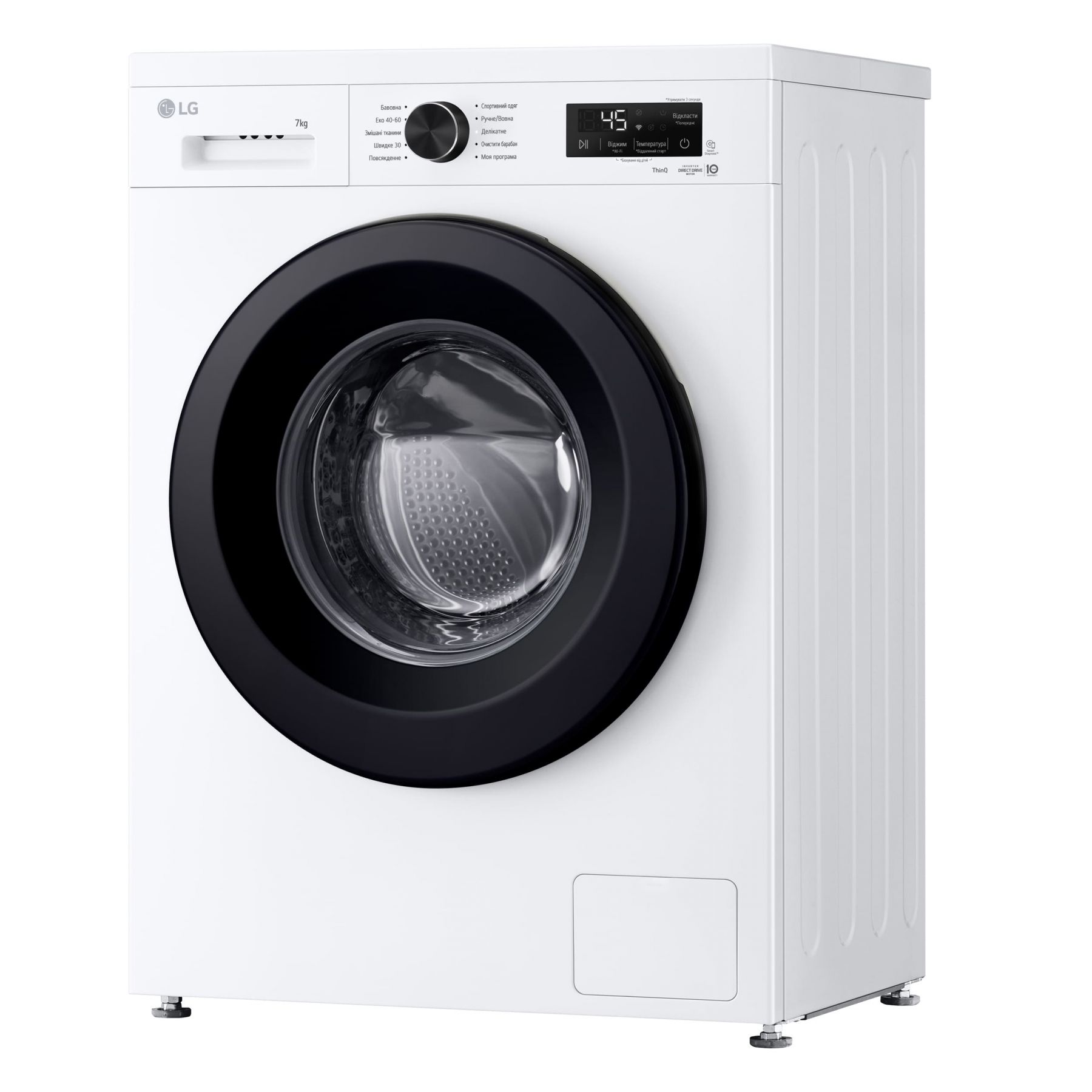 Програми:Бавовна, Делікатна, спортивний одяг, Швидке прання, Моя програма, Еко 40-60, Додаткові програми прання, що завантажуються через додаток LG ThinQ, Вовна / Ручне прання, Змішані тканини, Повсякденне прання, Очищення барабана, Звичайне полоскання, Пришвидшення прання