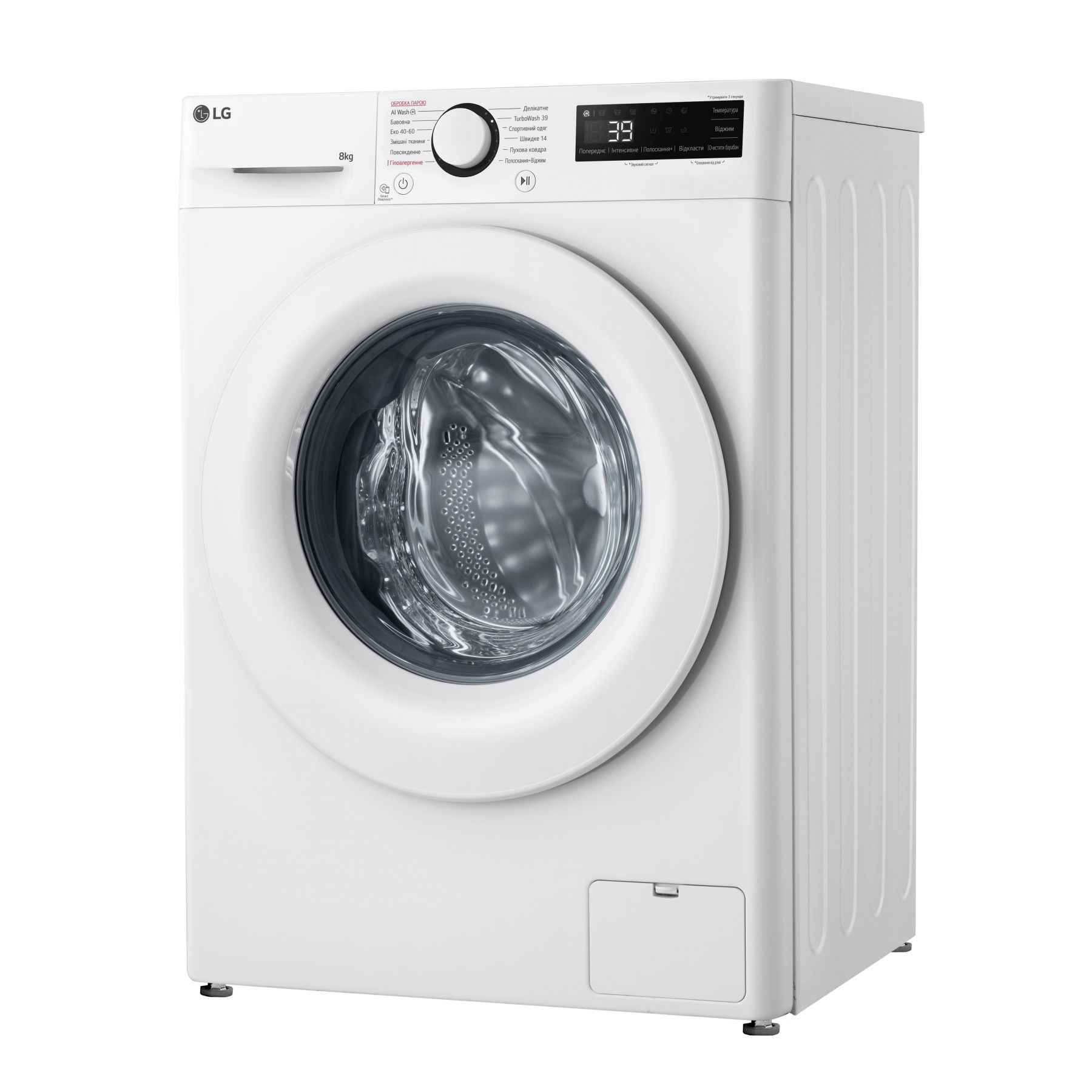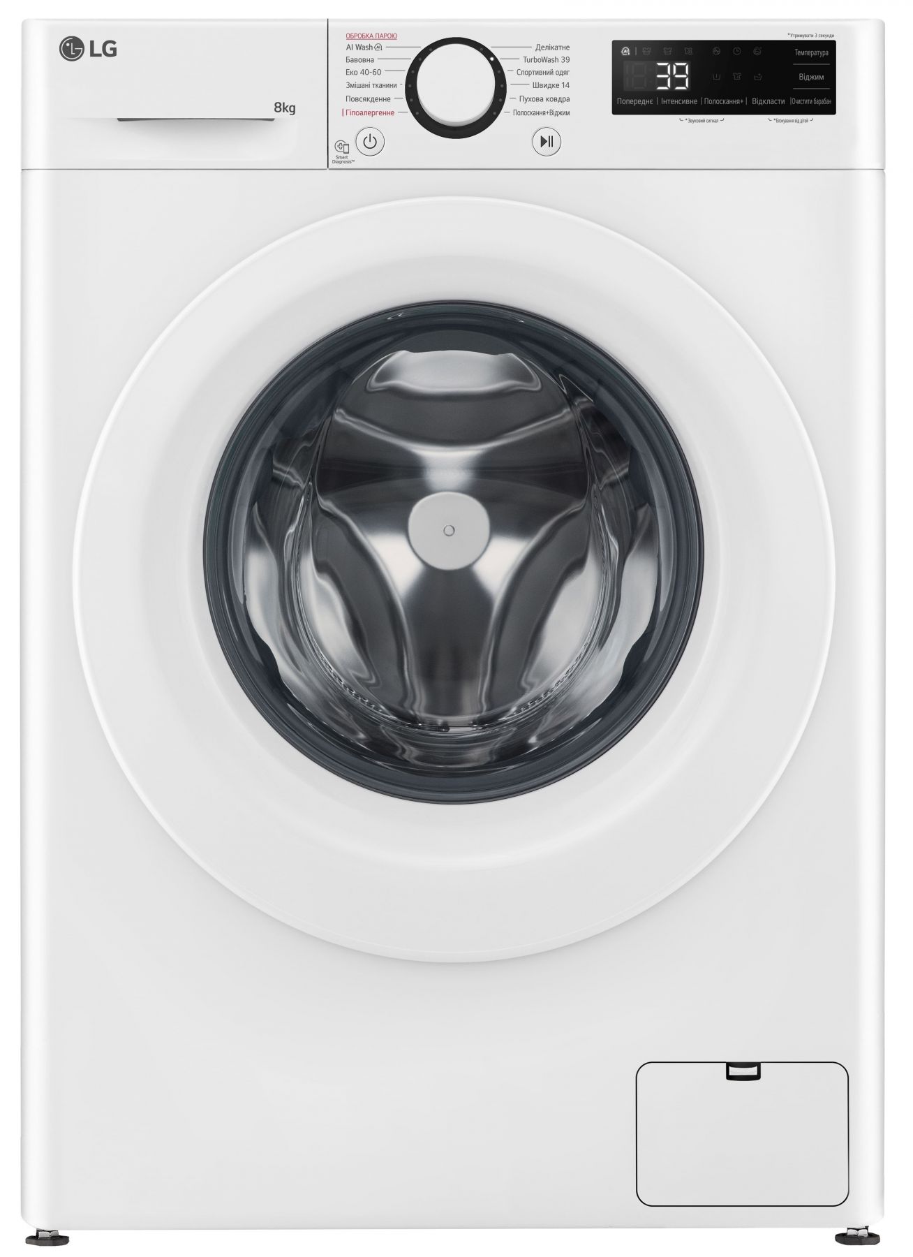 Програми:Бавовна, Делікатна, спортивний одяг, Моя програма, Еко 40-60, Вовна / Ручне прання, Змішані тканини, Повсякденне прання, Гіпоалергенне прання, TurboWash 39, Пухова ковдра, Прання з ШІ (AI Wash), Швидке 14, Очищення барабана