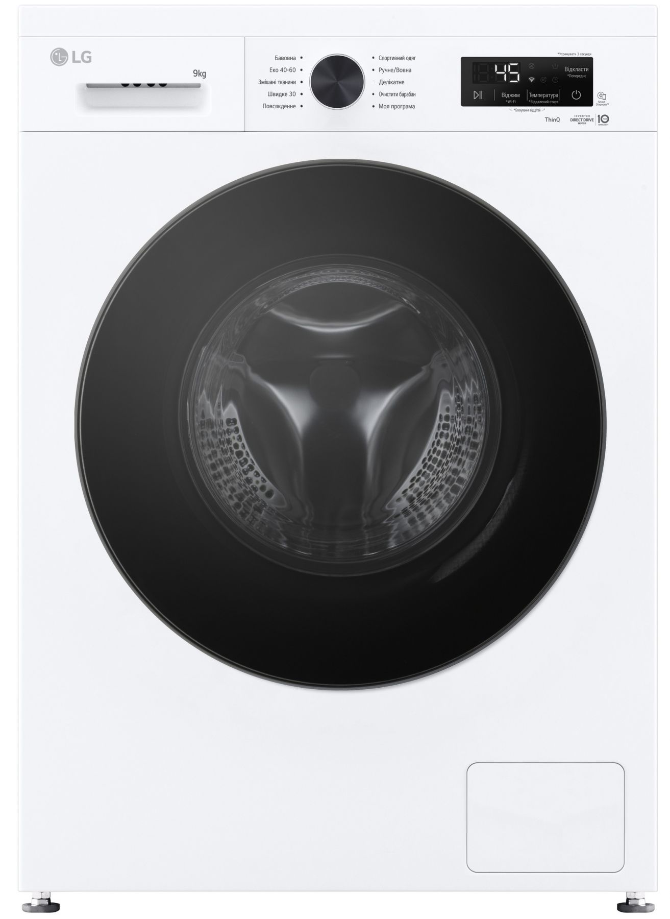 Програми:Бавовна, Делікатна, спортивний одяг, Швидке прання, Моя програма, Еко 40-60, Додаткові програми прання, що завантажуються через додаток LG ThinQ, Вовна / Ручне прання, Змішані тканини, Повсякденне прання, Очищення барабану