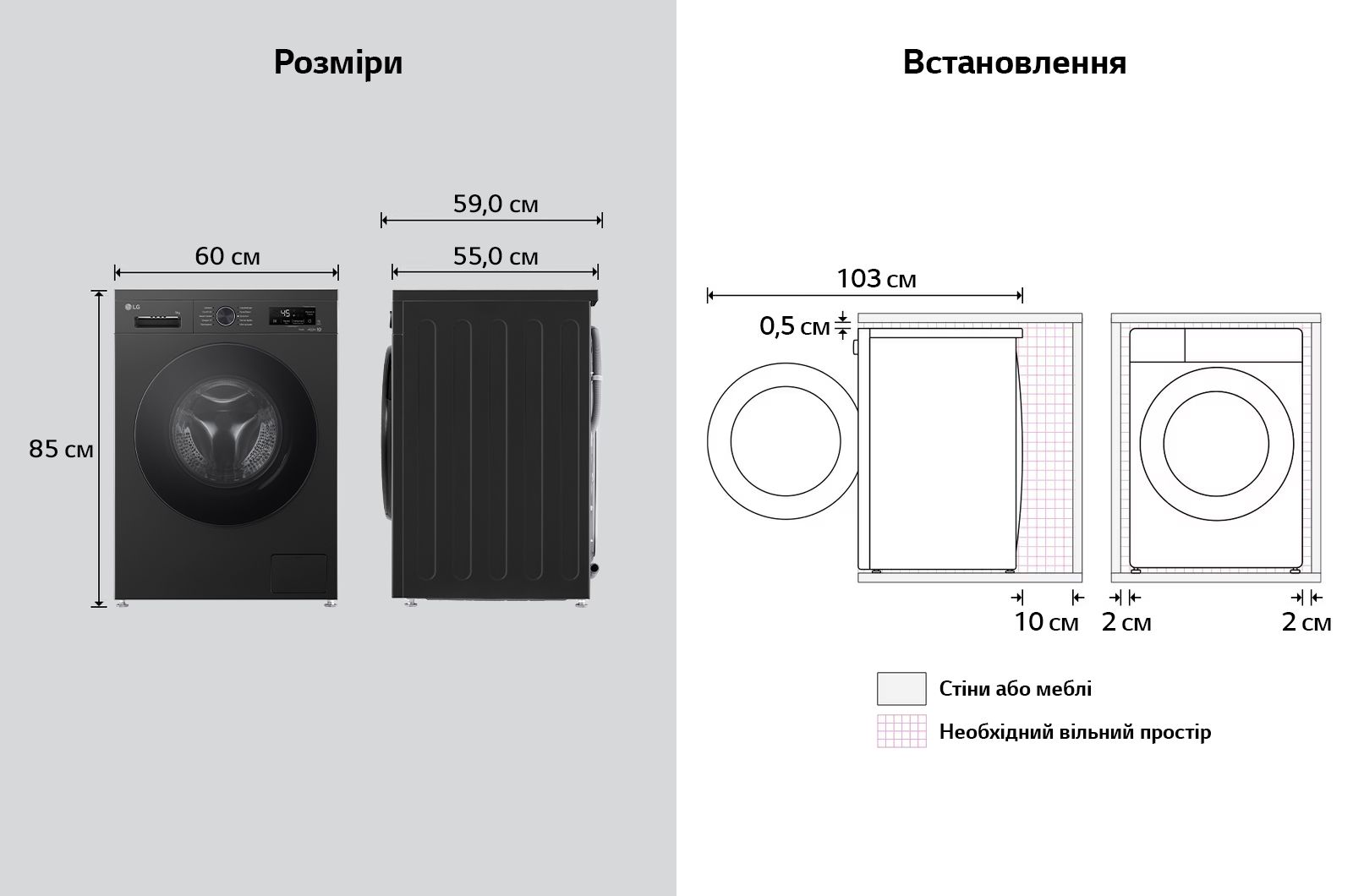 Особливості:індикатор залишкового часу, Функція прання парою Steam™, Технологія ''6 рухів турботи'' 6 Motion, Система зменшення рівня вібрації, Система контролю піноутворення, Технологія контролю напруги (174-400 В), Блокування панелі керування від дітей, індикатор етапу циклу прання, індикація обраних параметрів програми прання, індикація незачинених дверцят, індикація помилок у роботі, затримка завершення циклу прання (3-19 годин), автоматичний перезапуск зі збереженням попередніх налаштувань, відкриття дверей: праворуч, індикація режиму "Відкласти завершення", індикація режиму "Блокування від дітей", індикація режму "Віддалений старт", Завантаження додаткових програм через додаток LG ThinQ™ по Wi-Fi, загартоване скло дверцят, Можливість завантажити додаткові програми прання, що завантажуються через додаток LG ThinQ, Віддалене керування через додаток LG ThinQ по Wi-Fi
