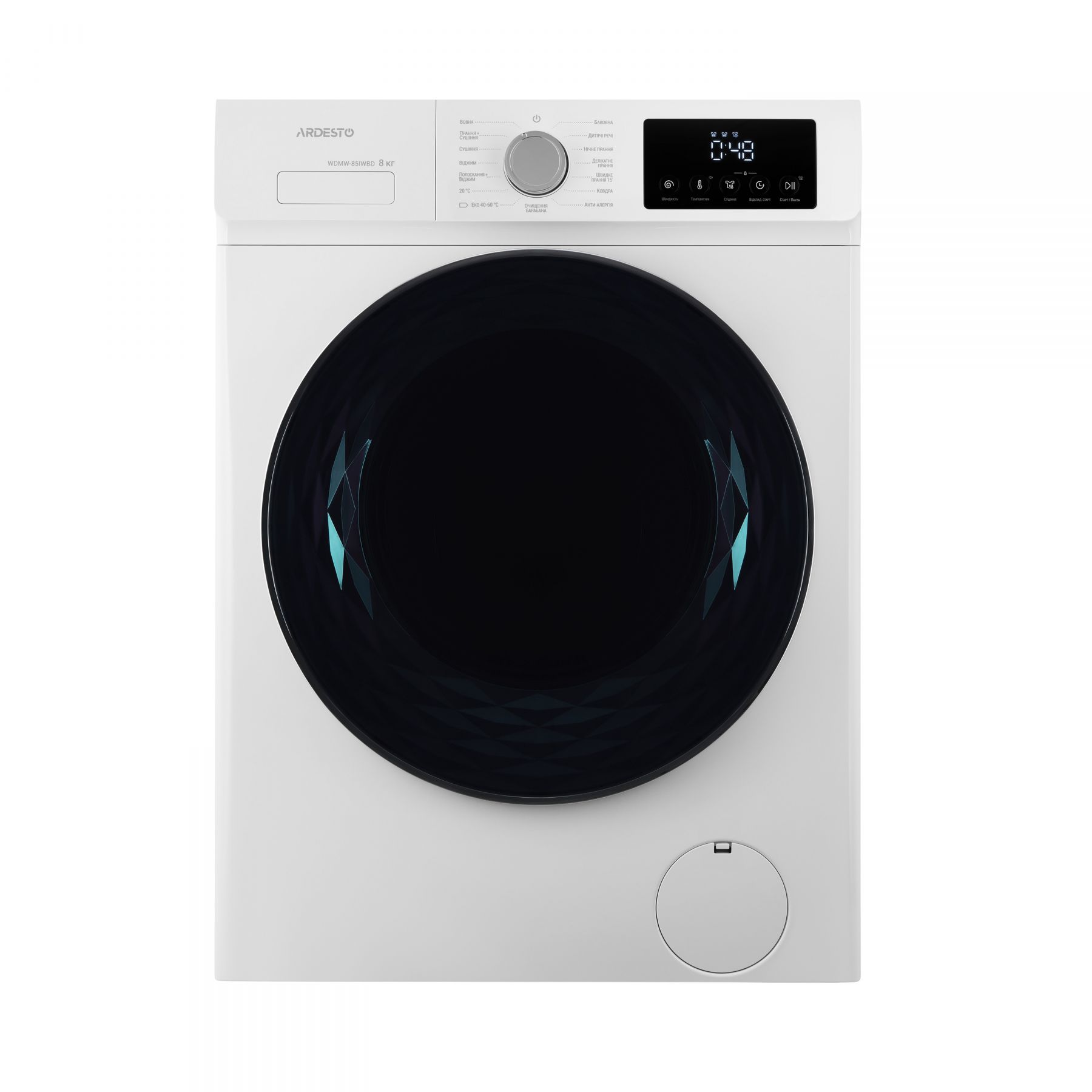 Фронтальна прально-сушильна машина ARDESTO справляється з пранням 8 кг і сушінням 5 кг білизни. Максимальна швидкість віджимання становить 1 200 об/хв, клас енергоефективності A+++. Інверторний двигун BLDC гарантує тиху, надійну й економну роботу. Модель підтримує 15 програм прання/сушіння, зокрема: «Еко 40–60 °C», «Бавовна», «20 °C», «Делікатне прання», «Інтенсивне прання», «Вовна», «Нічне прання», «Протиалергія», «Одяг дітей», «Ополіскування + віджимання», «Прання + сушіння 60'», «Швидке прання 15'». Передбачено цифровий дисплей, відкладений старт, можливість додавання білизни під час циклу та функцію очищення барабана водою, нагрітою майже до кипіння.