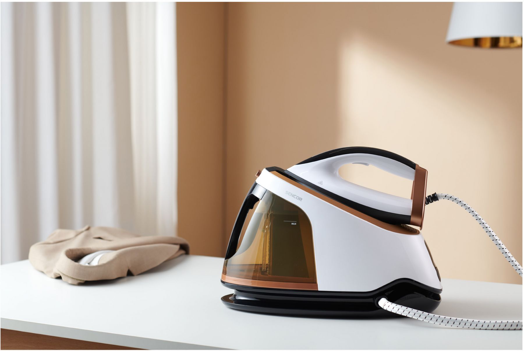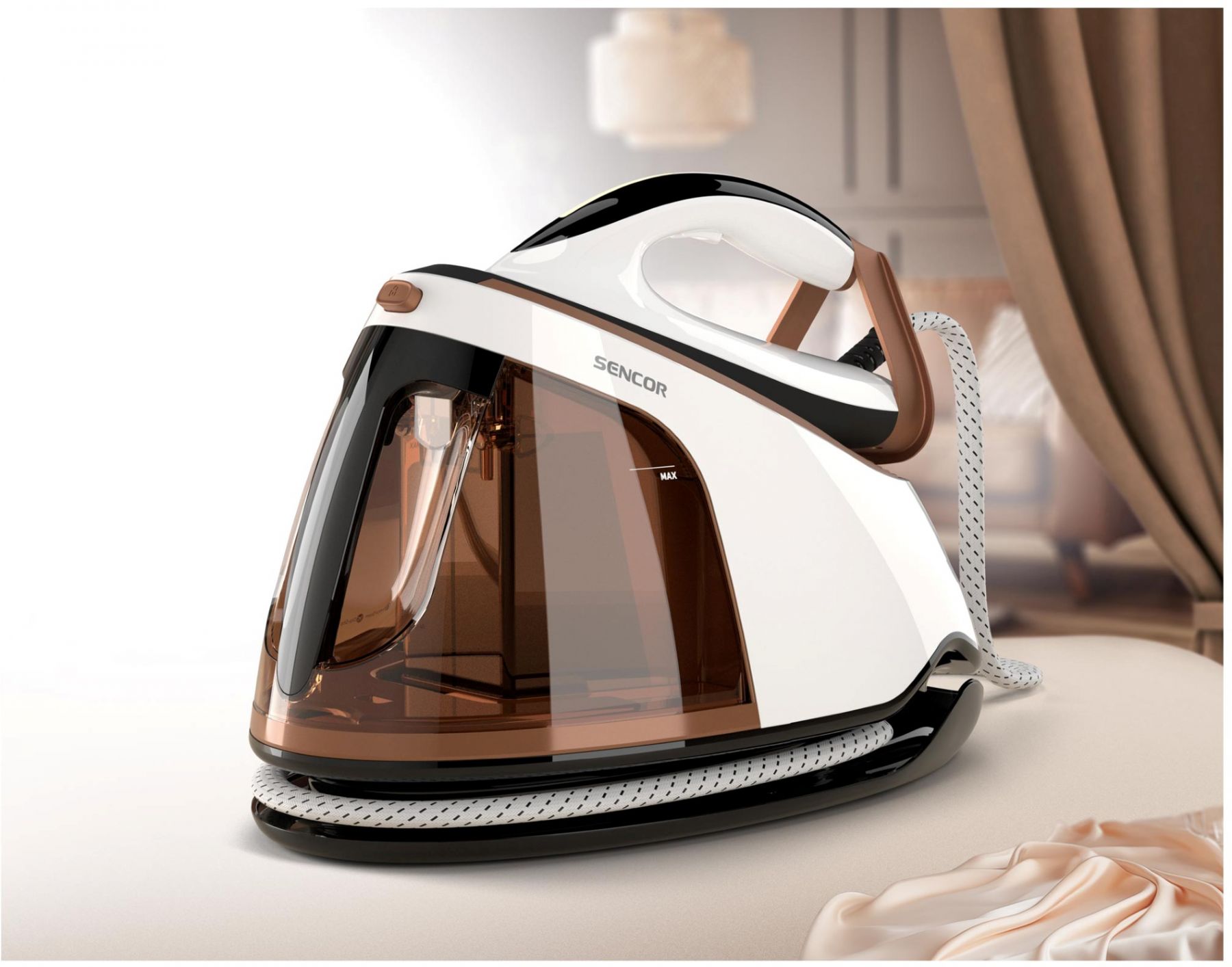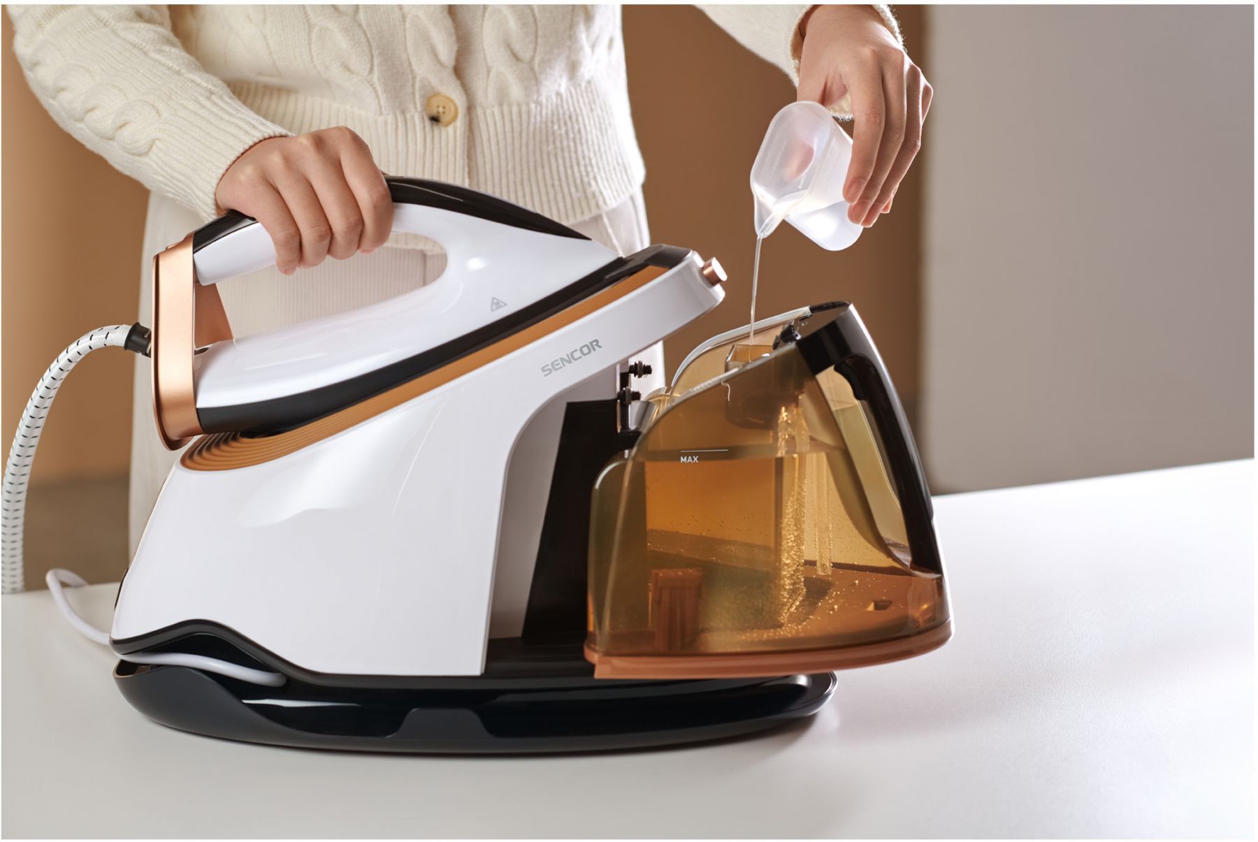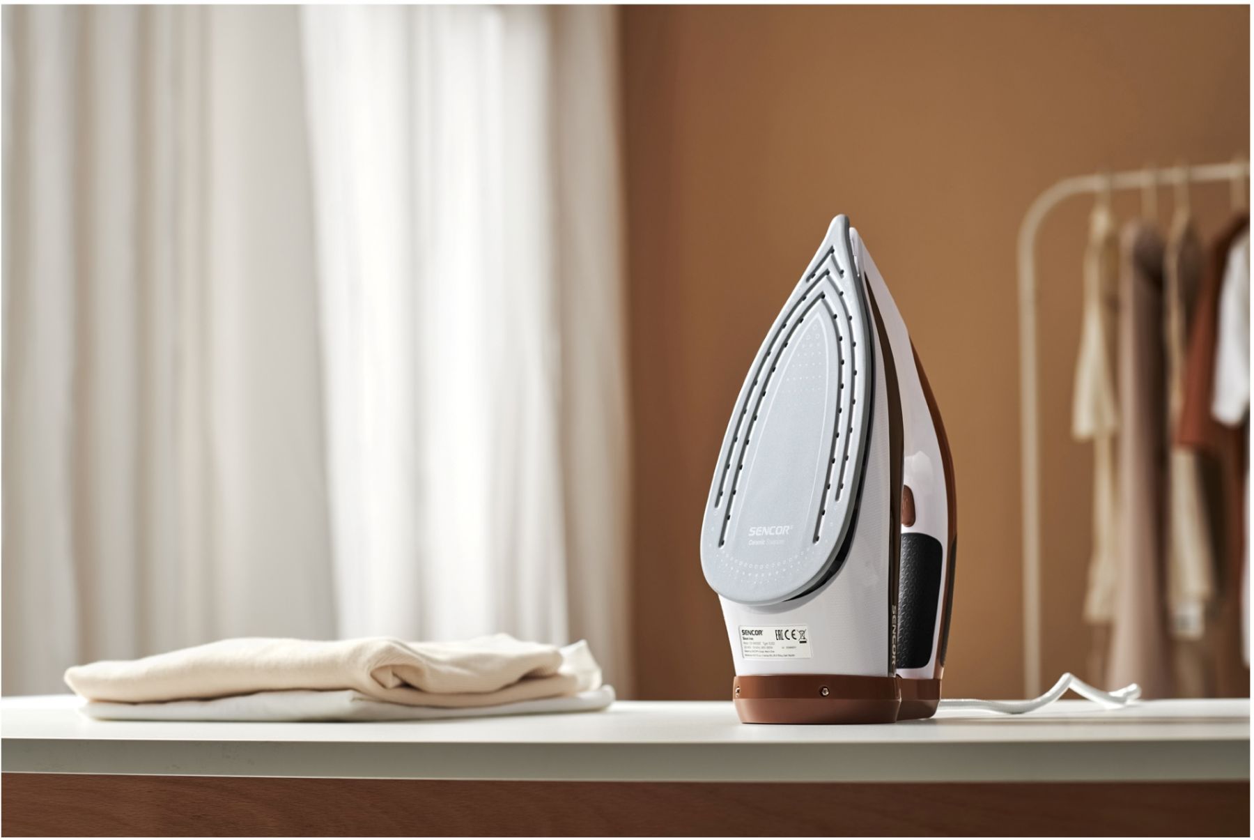 Праска-парогенератор Sencor, 3000Вт, 1500мл, паровий удар -430гр, постійна пара - 160гр, Anti-calc, керам. підошва, біло-коричневий