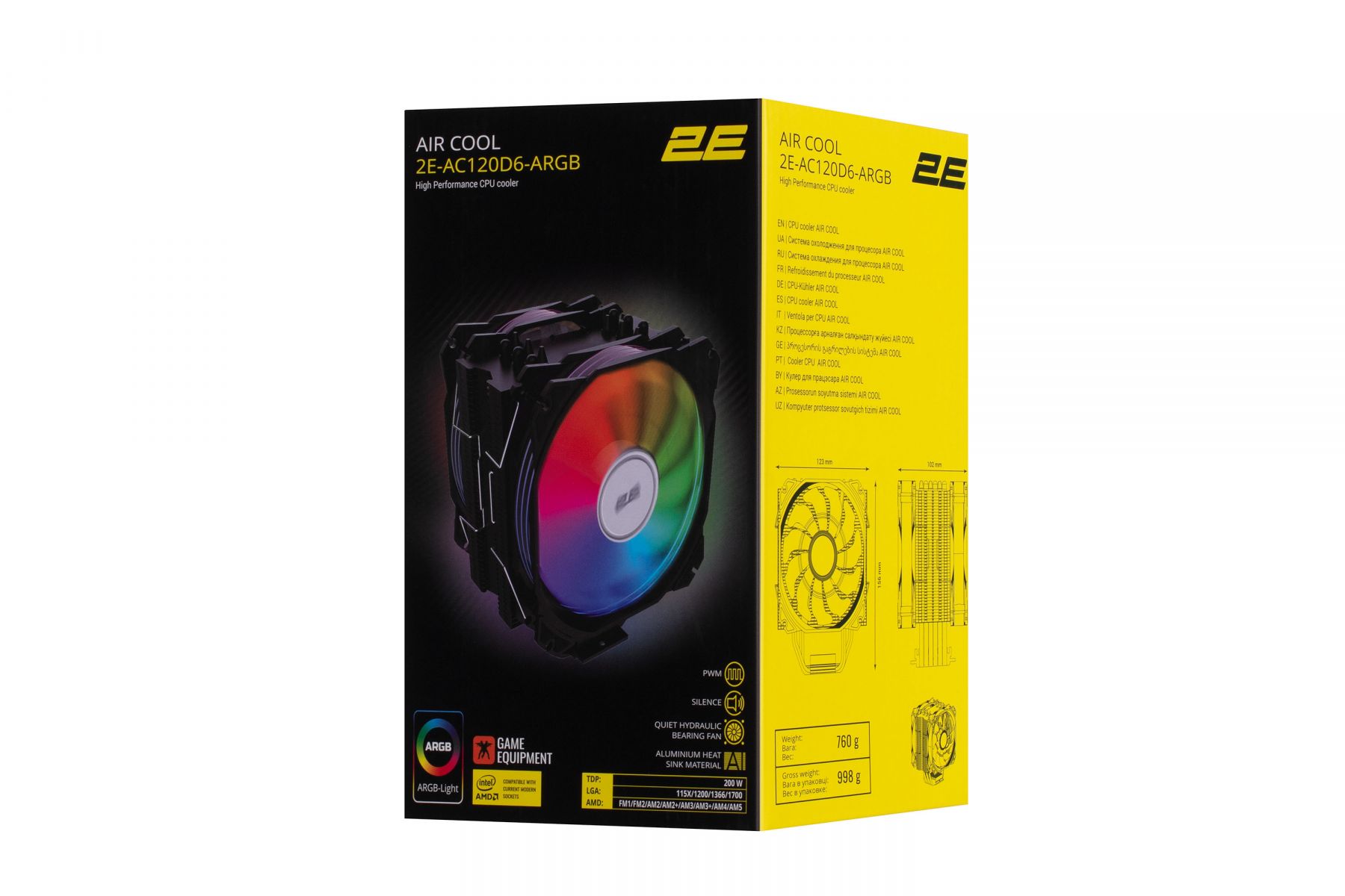 Процесорний кулер 2E GAMING Air Cool AC120D6-ARGB, LGA1851, 1700, 1366, 1200, 115x, AM5, AM4, AM3, AM3+, AM2, AM2+, FM2, FM1, 4pin PWM, 3pin +5VARGB, TDP 200W