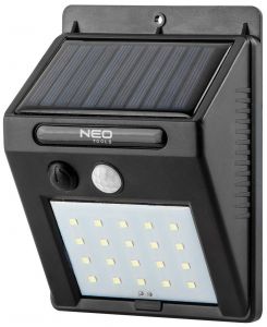 Прожектор Neo Tools, живлення від сонячного світла, 250 люмен, 1200 мАг, 3.7 Li-Ion, SMD LED, датчик руху та сутінків, IP44. Практичний та екологічний настінний світильник Neo Tools, 99-055 на сонячних батареях. Оснащений світлодіодом SMD 250 люмен. Пристрій має практичний датчик руху, що працює на відстані до 10 метрів та з кутом захоплення 120 градусів. Це дуже зручне рішення для людей, яким світло потрібне лише тоді, коли хтось знаходиться зовні. Для освітлення простору біля будинку, воріт, гаража, тераси, майстерні. Пристрій має вбудований літій-іонний акумулятор ємністю 1250 мАг і напругою 3,7 В. Для повної зарядки потрібно 5 годин і він здатний працювати на ньому ще 12 годин. Завдяки функції IC запобігає перезарядженню або розрядженню лампи. Висока якість та безпека підтверджується, зокрема, Європейський сертифікат CE. Ступінь захисту IP44.