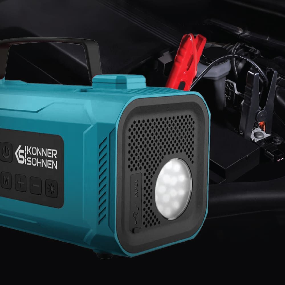 Німецька ТМ Könner & Söhnen представляє вашій увазі пускозарядний пристрій з акумуляторним компресором 4 в 1 KS JSP-2000 - це незамінний мультифункційний пристрій для вашого авто. Він поєднує у собі функції пускового пристрою та зарядного пристрою для акумуляторів бензинових або дизельних авто, функцію акумуляторного компресора для широкого спектру завдань, а також може також виконувати функцію повербанку та ліхтаря. Техніка німецької ТМ Könner & Söhnen вже успішно продається в понад 20 країнах Європи, пройшла багаторічне випробування вибагливими європейськими споживачами та має безліч позитивних відгуків.