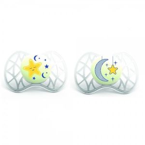 У наборі 2 ортодонтичні пустушки. Вони мають дещо скошену форму, завдяки якій більш зручно розміщуються ротовій порожнині дитини. Особлива форма сприяє формуванню правильного прикусу у дитини. Пустушки виготовлені з безпечних матеріалів. Підходять для дітей з народження.