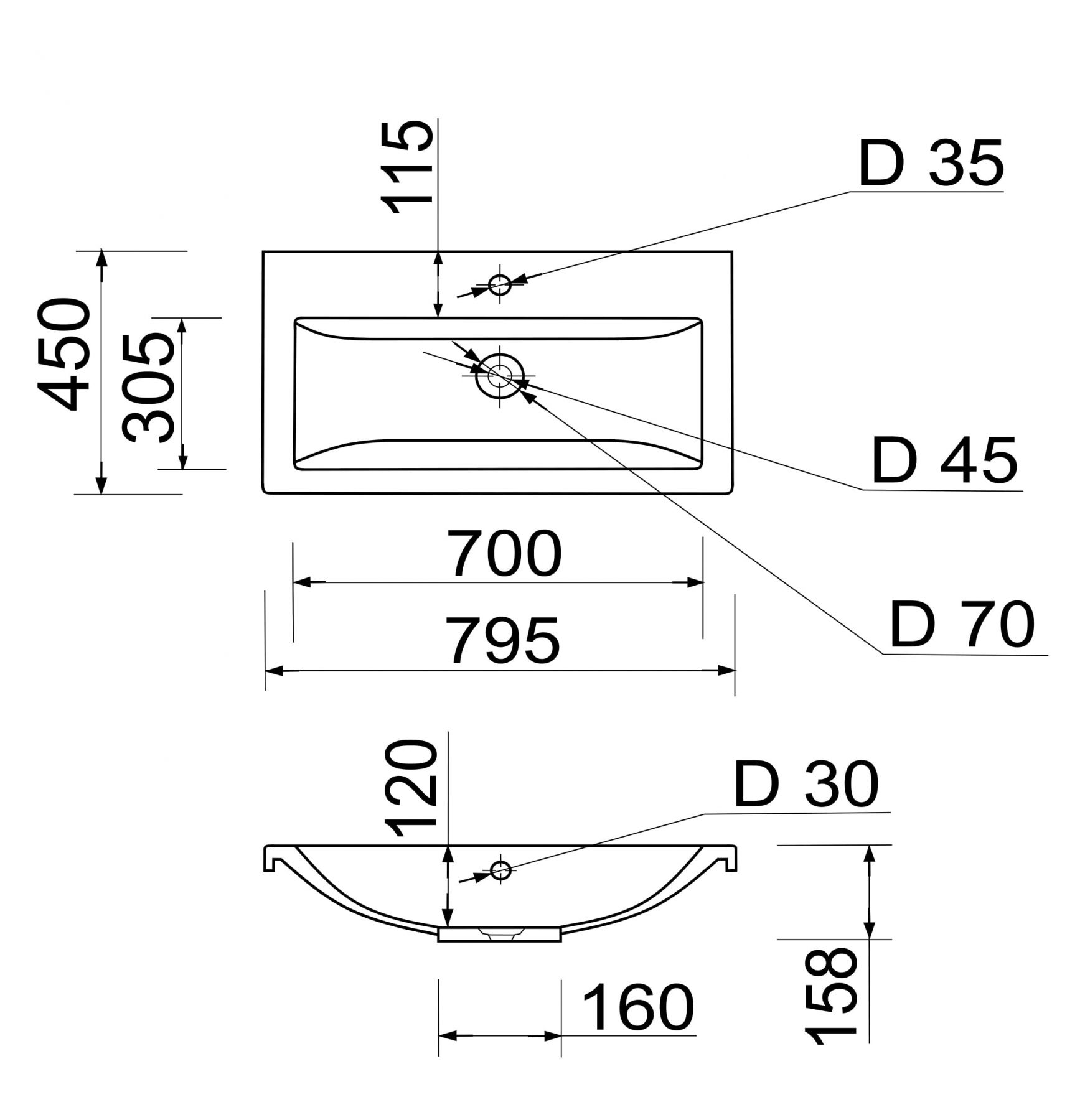 Раковина Adamant CERS має прямокутну форму, виготовлена зі штучного каменю з розмірами 795 x 450 x 158 мм та білим кольором. Накладний тип встановлення з отворами для змішувача та переливу дозволяє монтаж на тумбу. Матеріал створений за технологією Solid Surface, стійкий до впливу та довговічний.