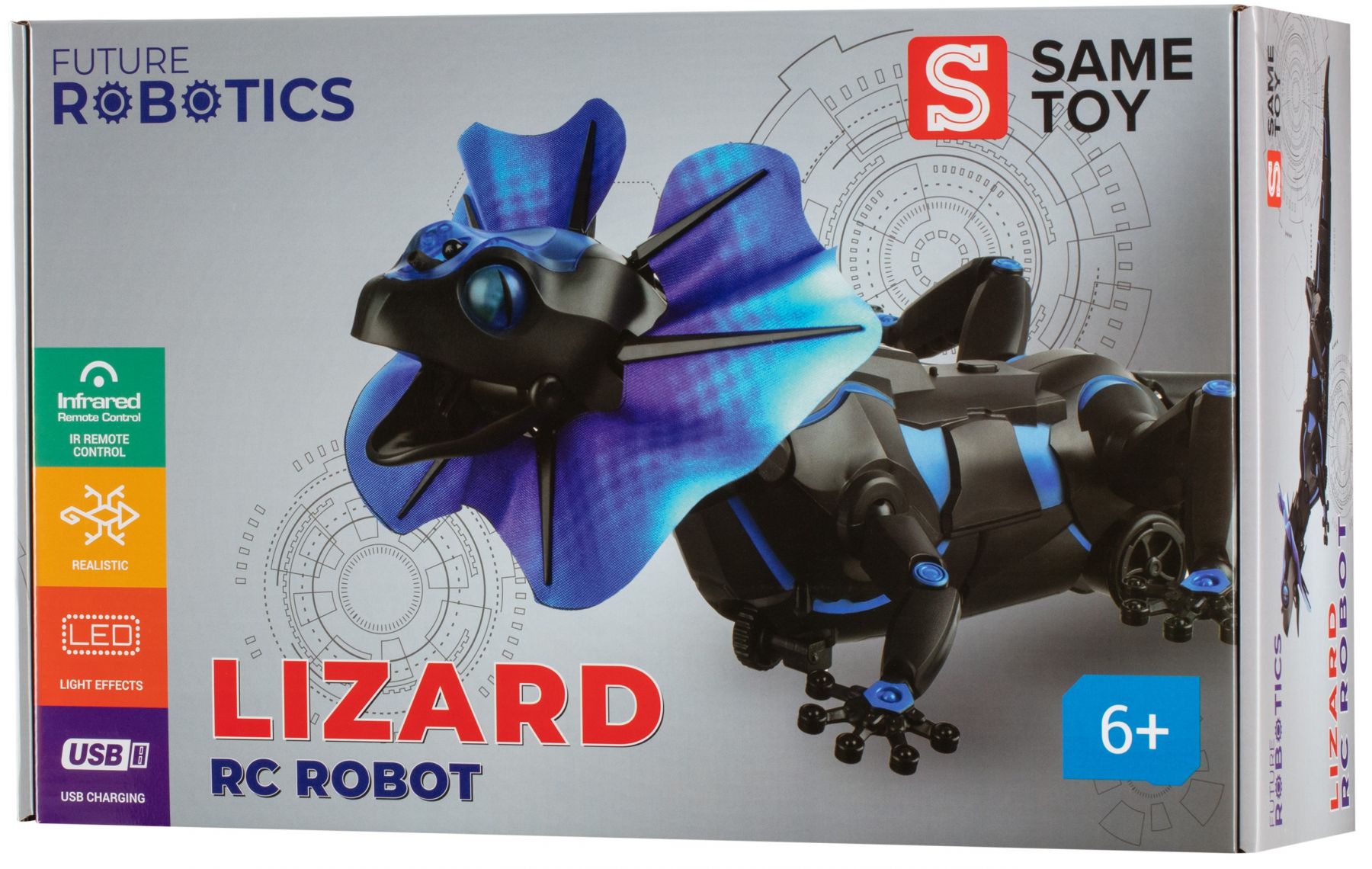 Робот Same Toy Ящірка на радіокеруванні створений як реалістична копія плащеносної ящірки. Модель відтворює характерну поведінку рептилії, реагує на перешкоди та супроводжується звуковими ефектами. Яскравий комір і рухливі елементи надають грі динаміки та видовищності. Робота можна використовувати в автономних режимах або керувати за допомогою пульта дистанційного керування. Ігровий процес сприяє розвитку уяви та різних типів мислення.