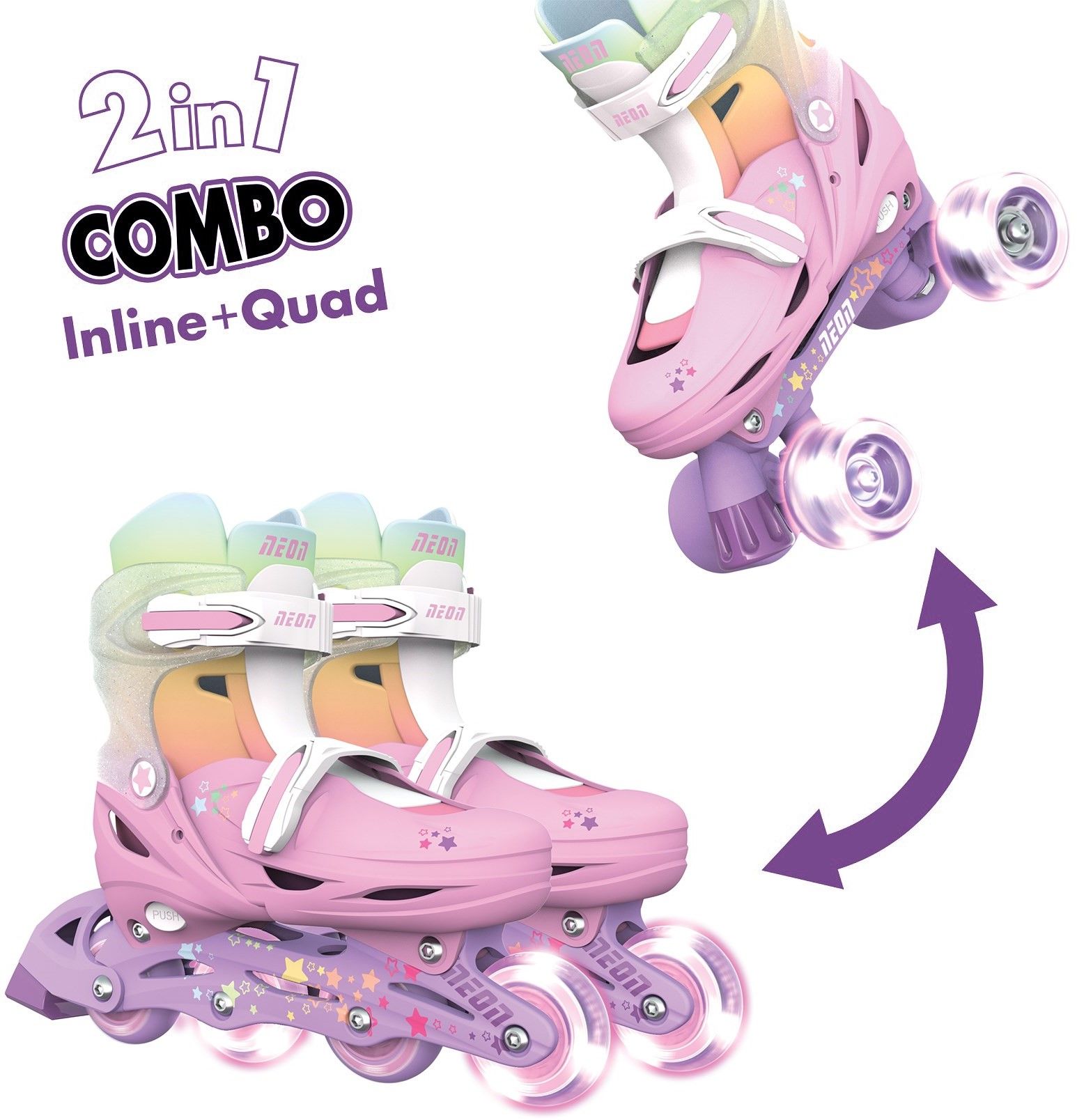 Дитячі розсувні ролики Neon Combo Skates. Це набір 2в1 включає відразу 2 типу роликових ковзанів Inline (Лінійні, 4 колеса в ряд.) + Quad (по 2 колеса розташовані поперечно). Саме завдяки варіативності набір Neon Combo Skates буде зручний та корисний для дитини, якій тільки належить освоїти роликові ковзани. Завдяки можливості варіативного вибору типу роликів у даній моделі навчання буде проходити найбільш продуктивно і дозволить безпечно освоїти ролики використовуючи переваги кожного з типів.