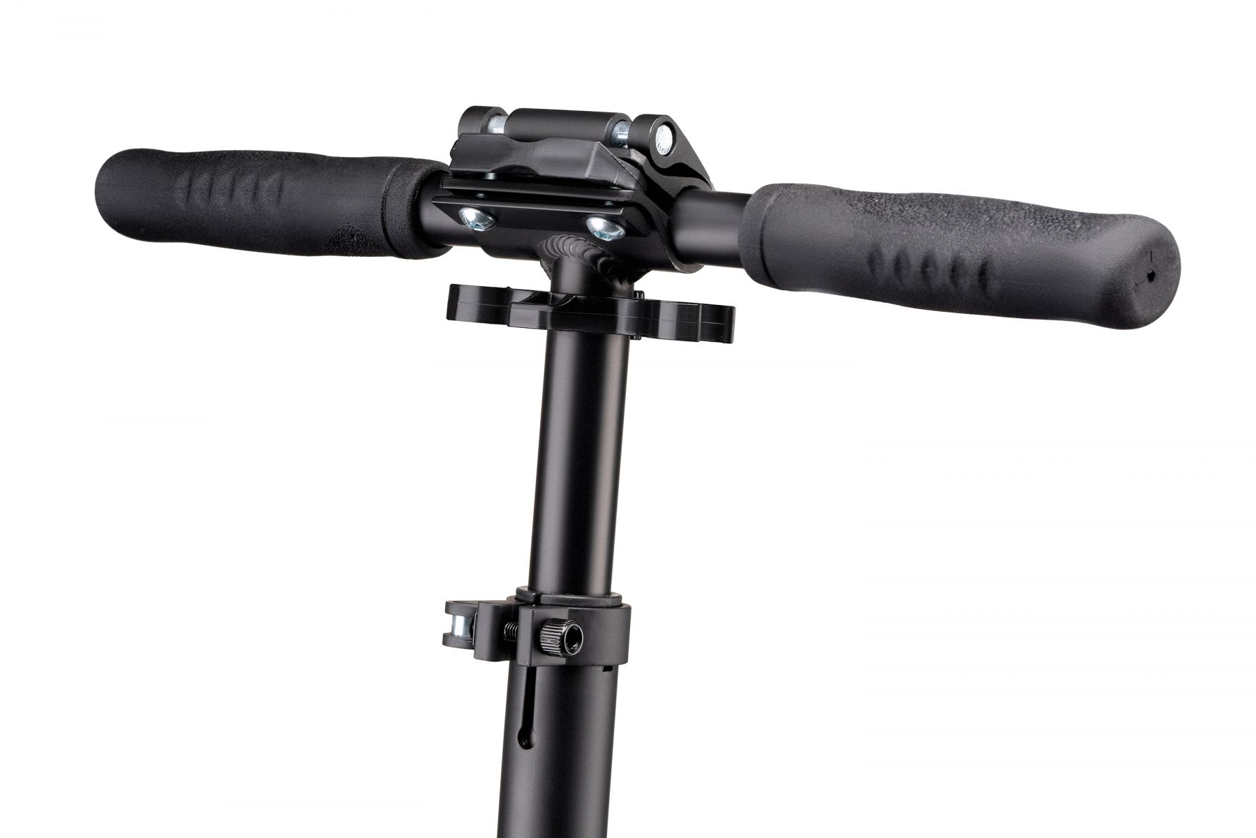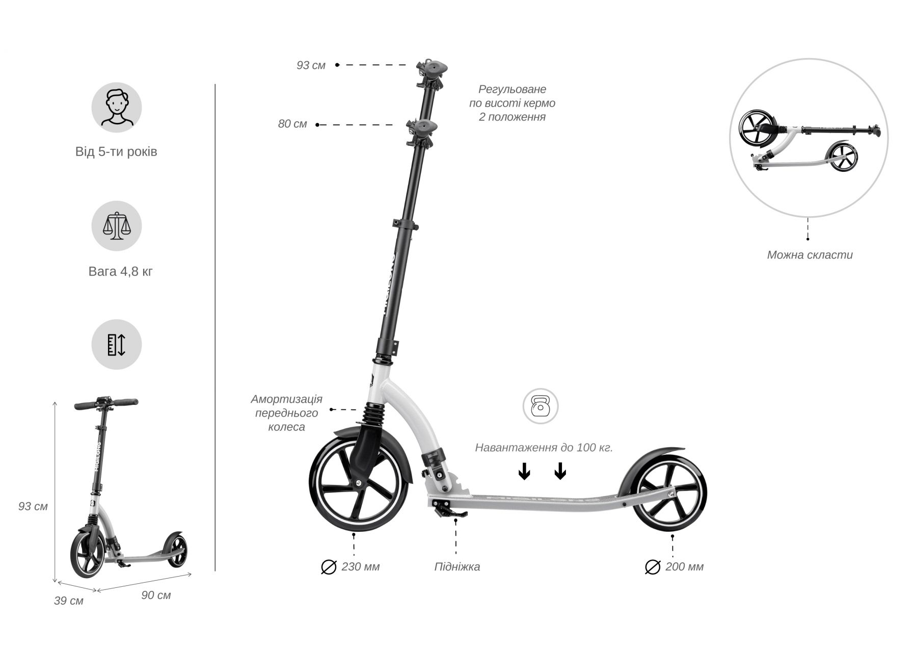 Особливості:Складна конструкція, амортизація переднього колеса, складні ручки з антивібраційним затискачем, підніжка
