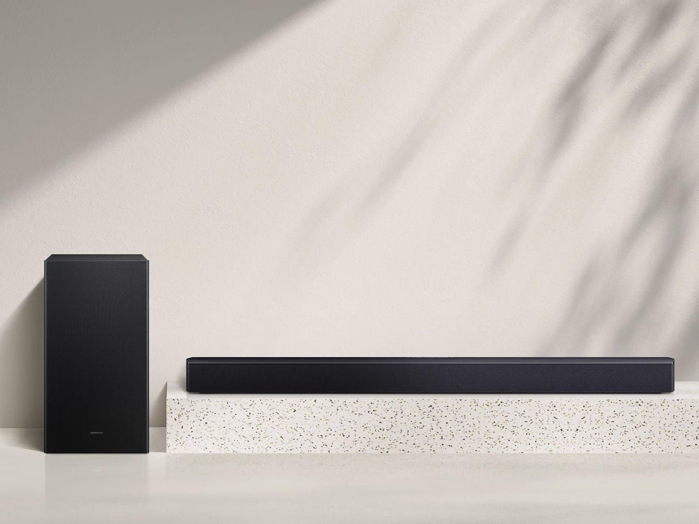 Саундбар Samsung HW-B450F (2025) — аудіосистема 2.1 потужністю 300 Вт із бездротовим сабвуфером. Підтримує DTS, Dolby 2ch, DTS Virtual:X, режими Bass Boost, Adaptive Sound, Game Pro, Voice Enhance та Night Mode. Оснащений Bluetooth 4.2, USB, HDMI-ARC, оптичним входом, відтворює формати MP3, AAC, OGG, FLAC, WAV, ALAC, AIFF.