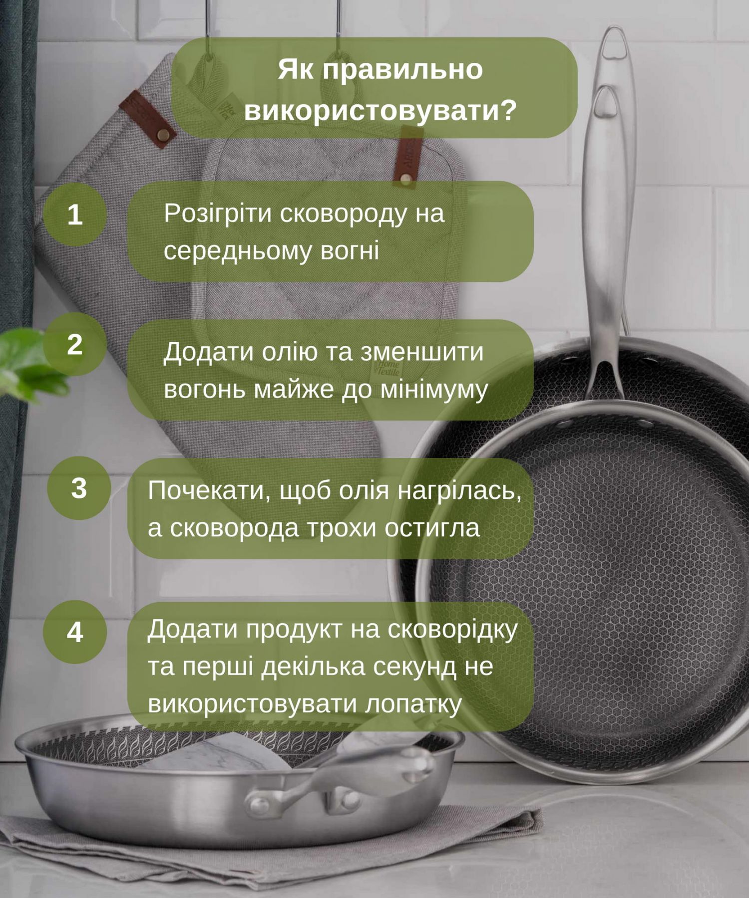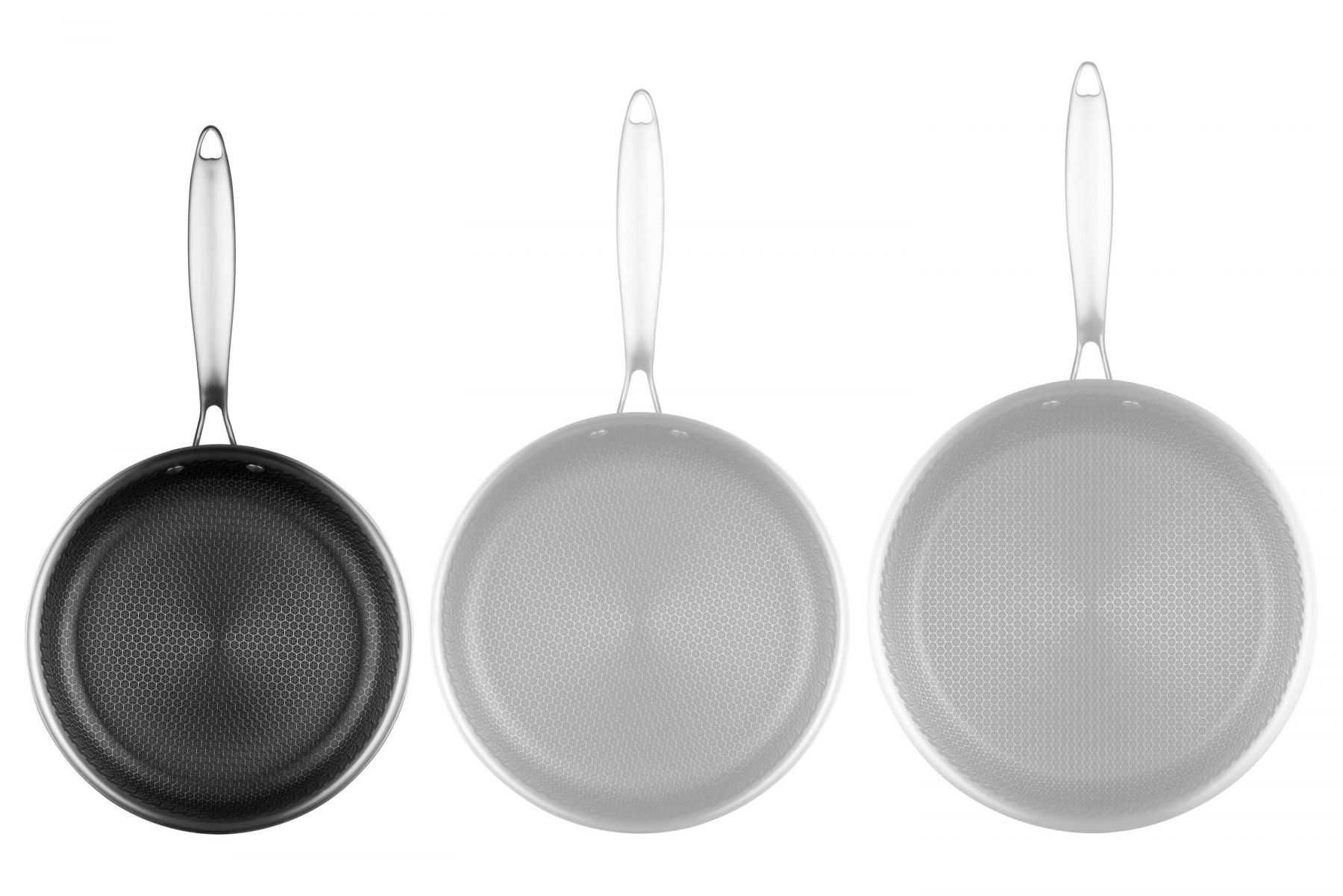 Виготовлена з нержавіючої сталі за технологією Triply, сковорода має протипригарне покриття, стійке до подряпин. Можна використовувати металеві аксесуари. Виріб можна мити в посудомийній машині. Діаметр моделі становить 24 см. За висоти 4,8 см сковорода має однакову товщину стінок і дна – 2,5 мм. Вирізняється широкою сумісністю: сковорідка придатна до використання на газових, галогенних, склокерамічних, індукційних та електричних плитах.