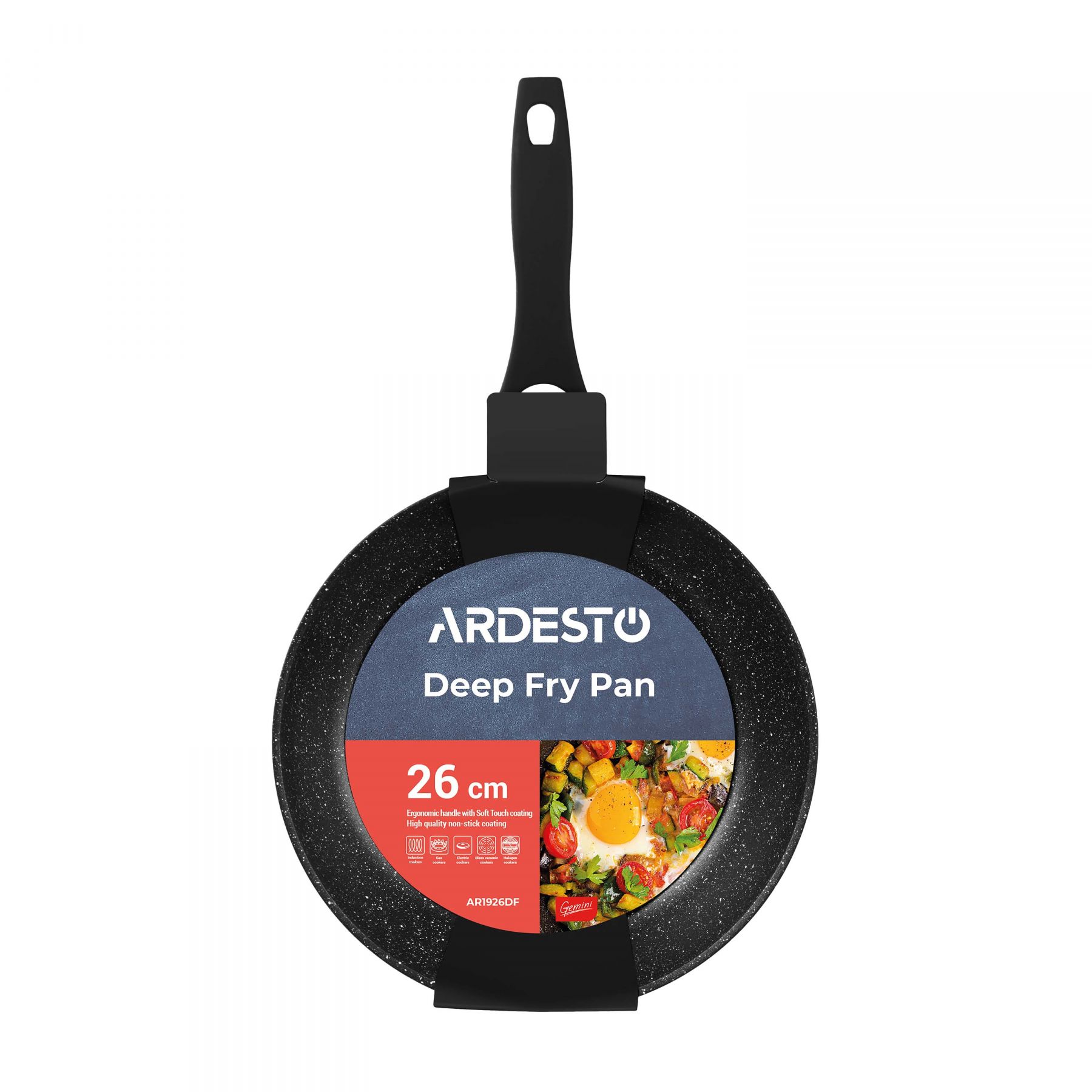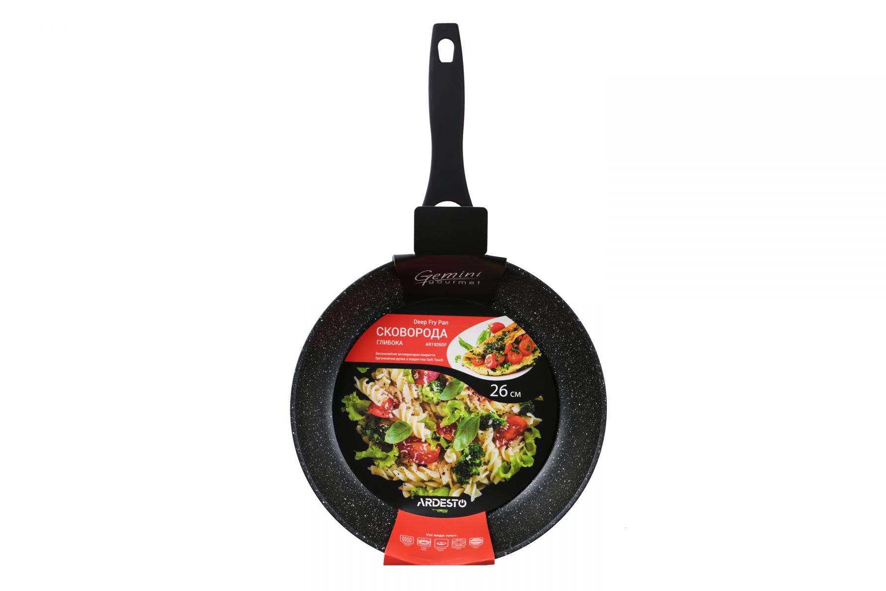 Алюмінієва глибока сковорода серії Gemini Gourmet Anzio чорного кольору з мармуровим антипригарним покриттям та термостійкою бакелітовою ручкою з Soft-touch покриттям. Сковорода сумісна з усіма видами плит, включаючи індукційну.