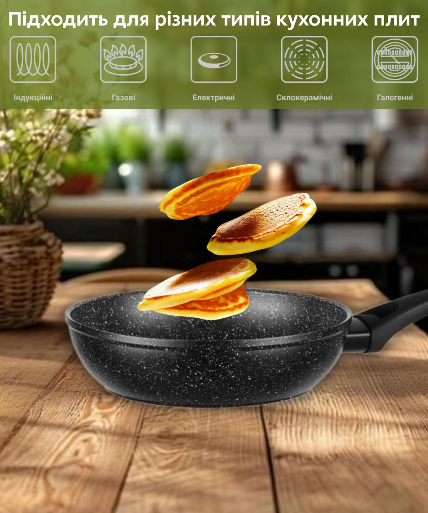 Сумісність із джерелами тепла:Газові плити, Електричні плити, Галогенні плити, Склокерамічні плити, Індукційні плити