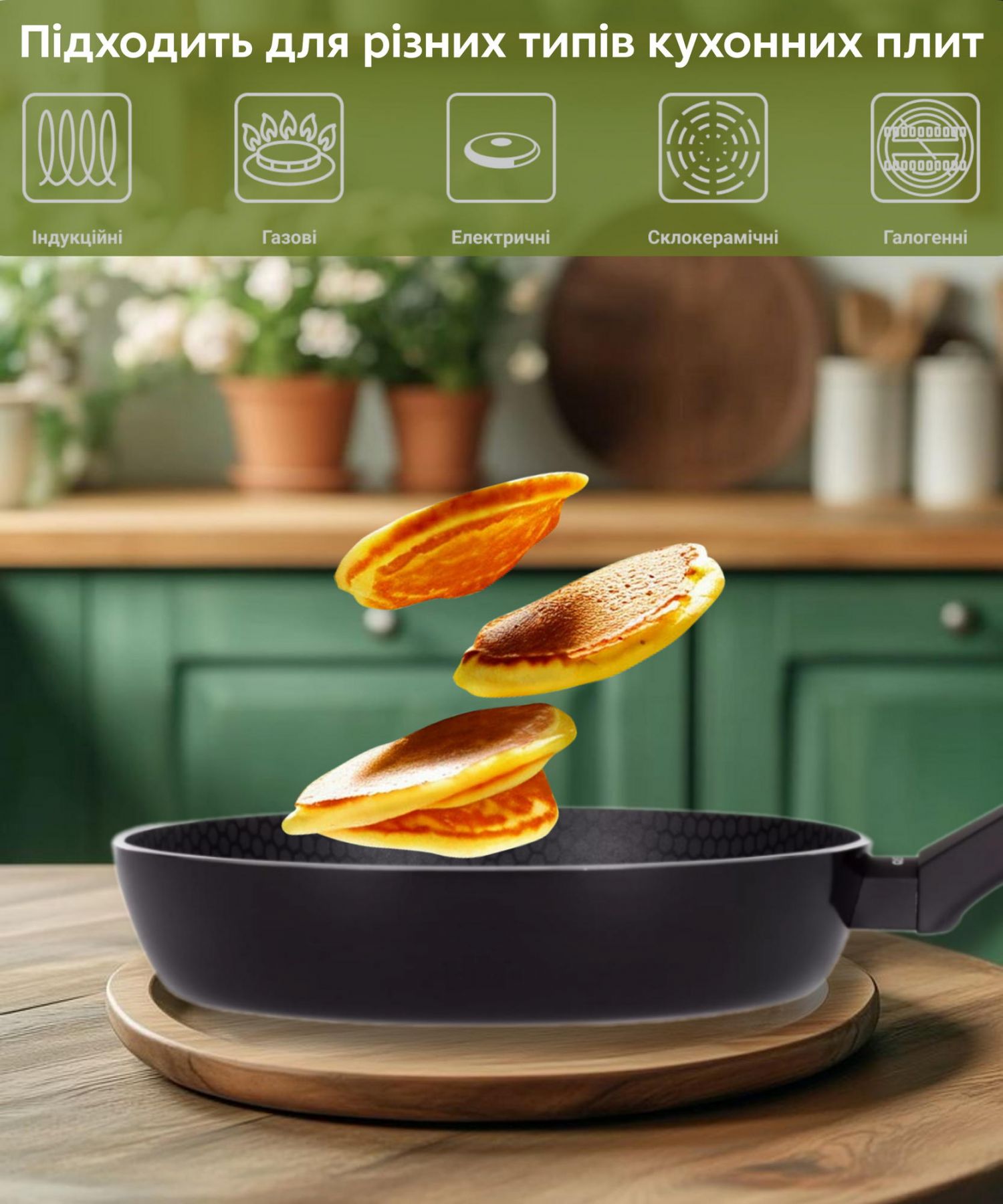Сумісність із джерелами тепла:Газові плити, Електричні плити, Галогенні плити, Склокерамічні плити, Індукційні плити
