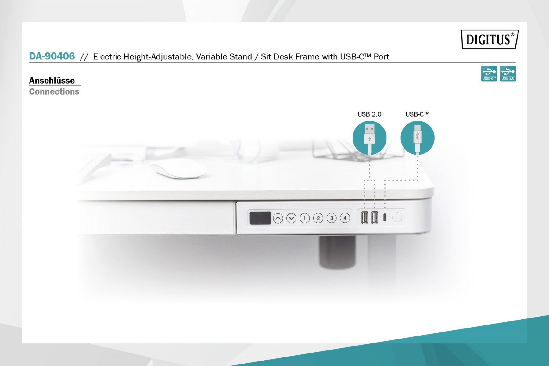 Особливості:вбудована зарядна станція USB: 1 x USB-C, 2 x USB A, вбудоване блокування клавіатури для запобігання випадковому включенню, вбудований ящик столу, інтелектуальна панель управління: 4 місця для зберігання, потужний двигун для плавного регулювання висоти