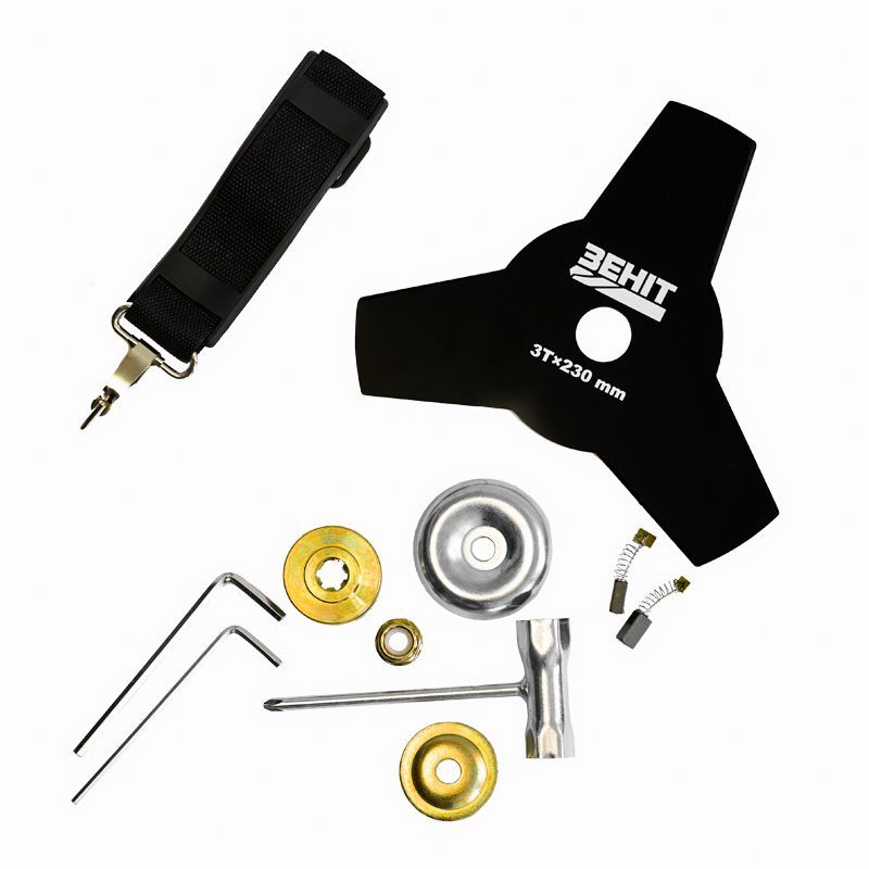 Комплектація:Гарантійний талон, інструкція з експлуатації, захисний кожух, пакувальна коробка, додаток, ріжуча головка з жилкою, наплічний ремінь, передня рукоятка, тример садовий, Набір фіксуючих елементів, набір інструментів для складання/регулювання, дисковий ніж із трьома лезами