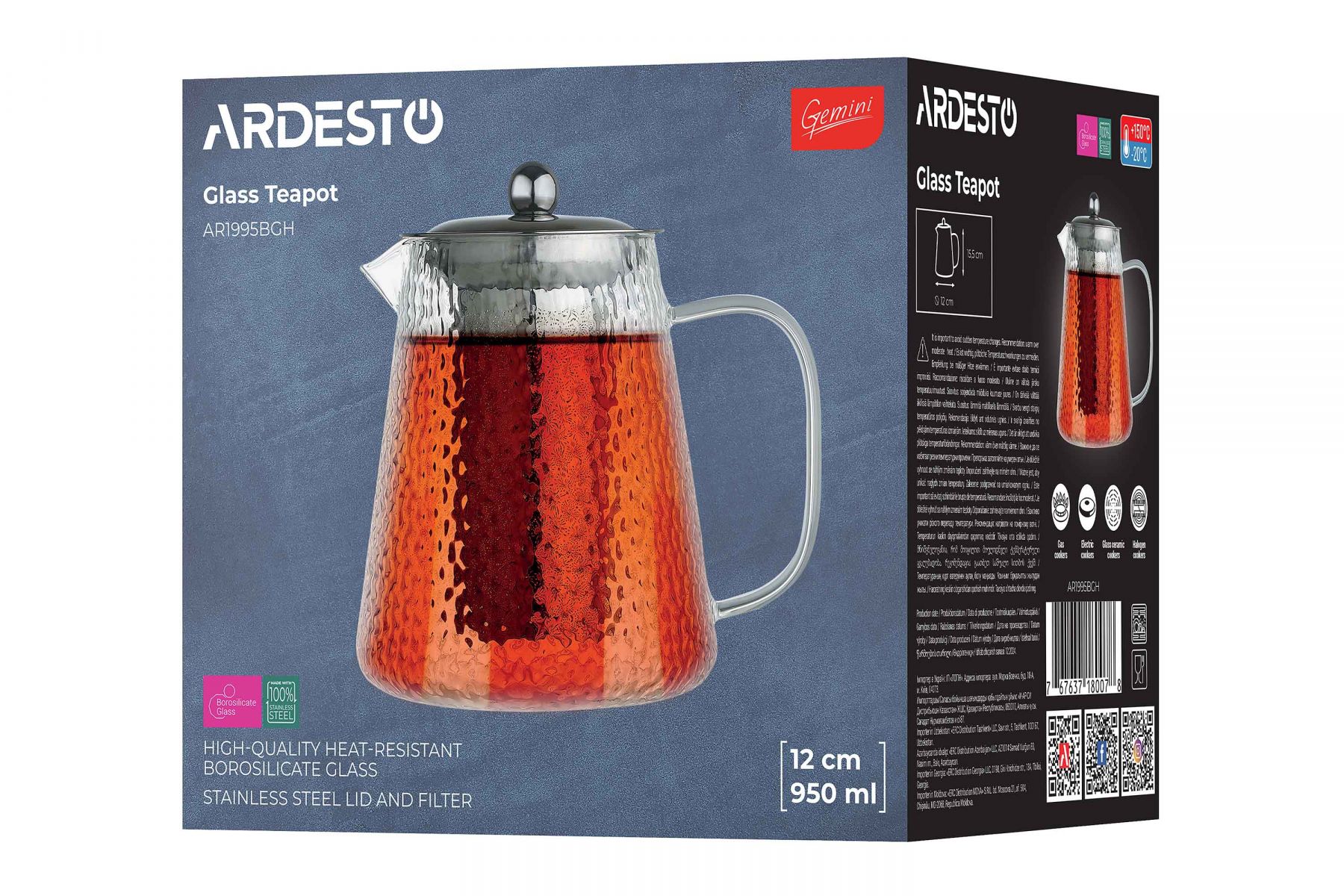 Заварник ARDESTO Gemini виготовлено з боросилікатного скла, яке не здатне вбирати запахи, тому смак чаю завжди залишатиметься незмінним. Ситечко з нержавіючої сталі надійно утримує всередині чайне листя. Термостійкість заварника становить від -20 до +150 °C. Об’єм моделі – 950 мл, що дає змогу приготувати до 5 чашок чаю одночасно. Це ліпший вибір для сімейних обідів, вечірок з друзями або використання в офісі. Заварник згодиться для різних видів плит – газових, електричних, склокерамічних, галогенних, його можна підігрівати на помірному вогні та мити в посудомийній машині.
